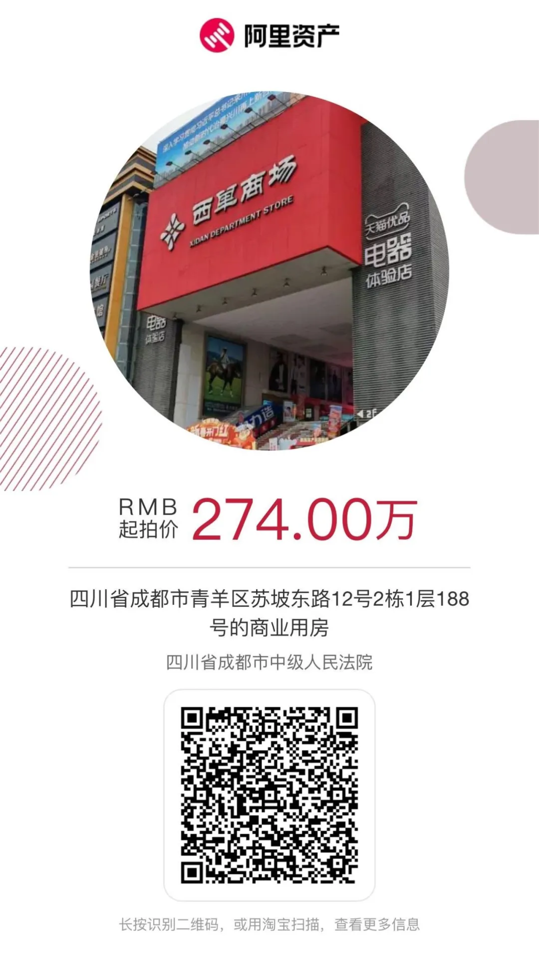 资产二:四川发展资产管理有限公司关于成都市青羊区苏坡东路12号商业用房抵押资产(西单商场):关于位于成都市青羊区苏坡东路12号商业房产合计30处,面积合计789.1㎡,我司已在阿里拍卖上进行司法拍卖,欢迎大家关注并参与竞拍(资产可单买),拍卖时间:2024年10月08日10:00开拍,详情请扫描以下二维码参与拍卖: